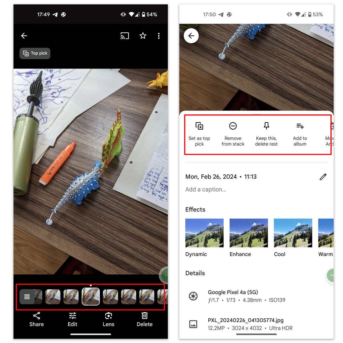 Khi nhấp vào một stack sẽ mở ra các ảnh được nhóm trong đó và có thể duyệt qua bằng cách vuốt ngang thanh filmstrip ở dưới. Bức ảnh được chọn làm thumbnail cho stack sẽ được gọi là Top pick – có thể chọn ảnh khác bằng cách duyệt ảnh đó xong chọn menu 3 chấm > Set as top pick. Ngoài ra còn có các tuỳ chọn khác như bỏ ảnh khỏi Stack, giữ một ảnh và xoá các ảnh còn lại…